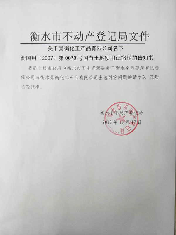 日前,景衡化工產品有限公司利用單方面違法辦理的土地證,要求廢除金鼎集團安裝分公司職工生產、生活用房的房產證。在有些部門不作為、亂作為的情況下,安裝公司職工只好到信訪局要求廢除景衡化工違法土地證。衡水市信訪局副局長吳小松親自接訪,在了解情況后積極與土地部門進行溝通。衡水市國土資源局在接到通知后,迅速作出反映,嚴格按照程序依法做出撤銷景衡土地證的決定。目前,市有關領導已經做出了同意撤銷《衡國用(2007)第0079號國有土地使用證》的批復。